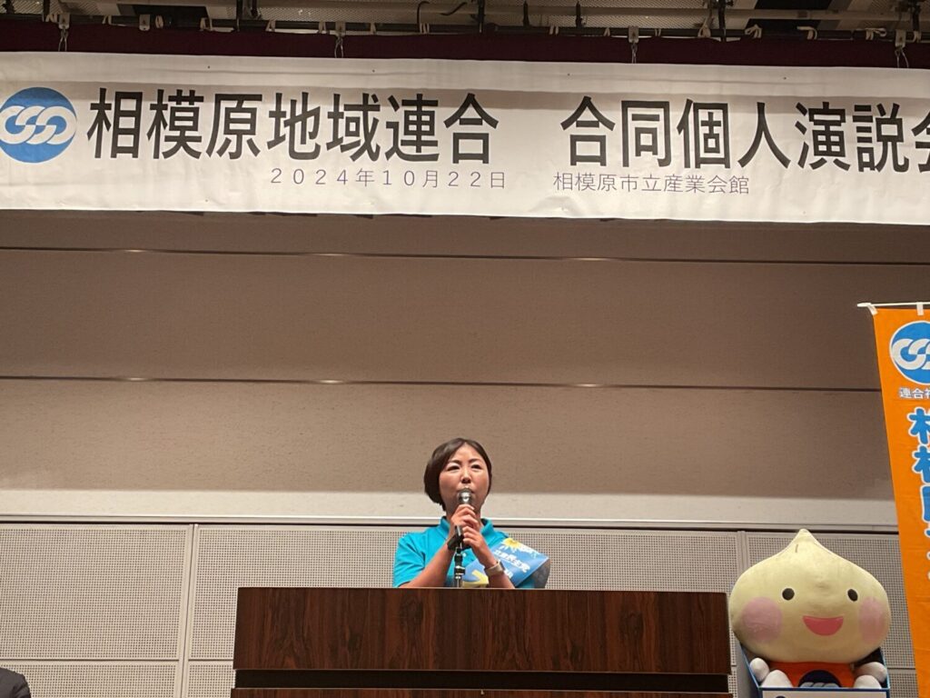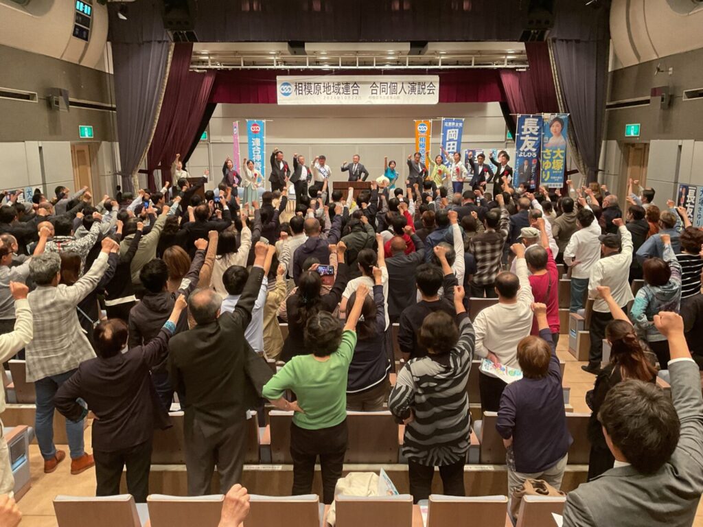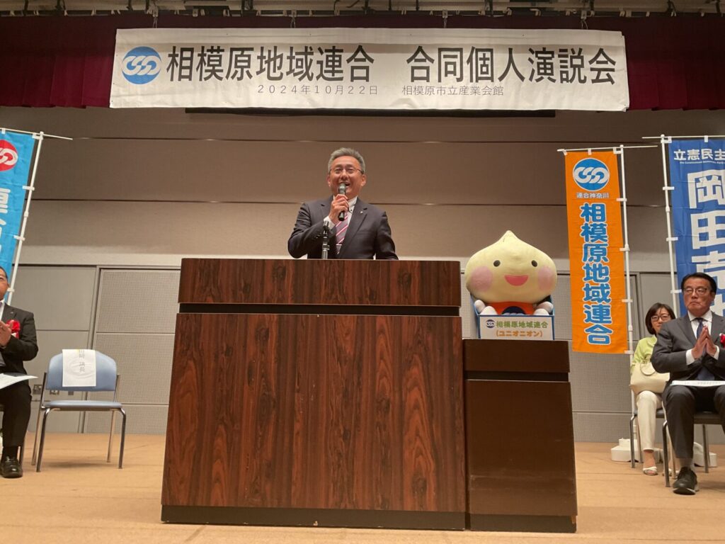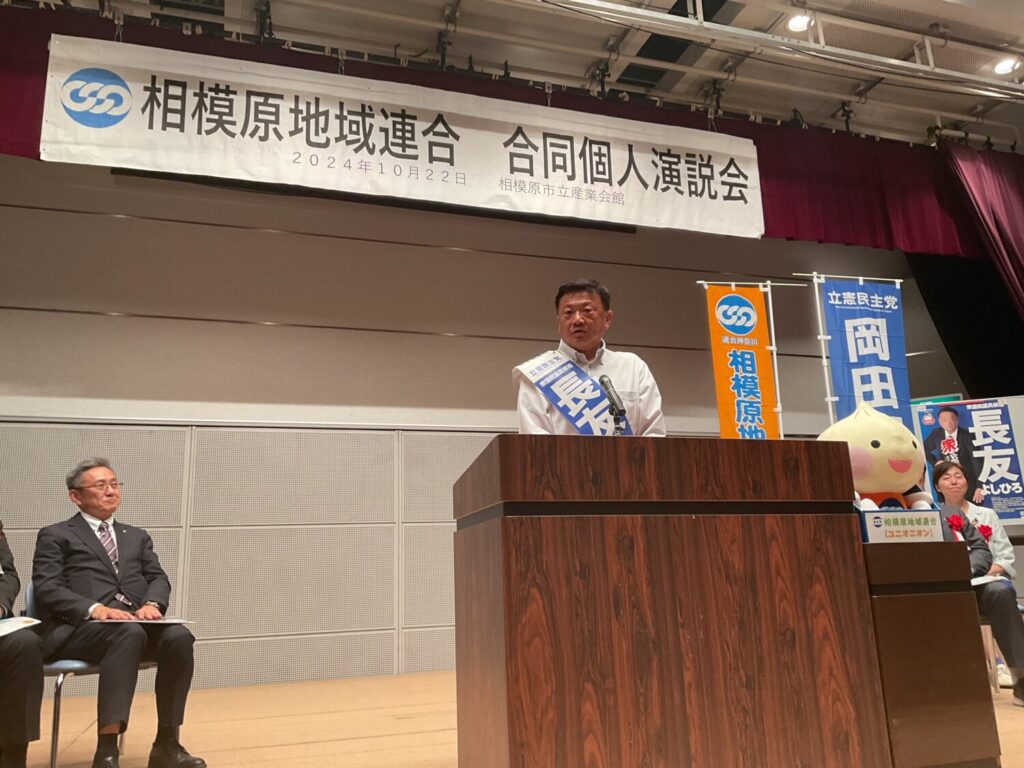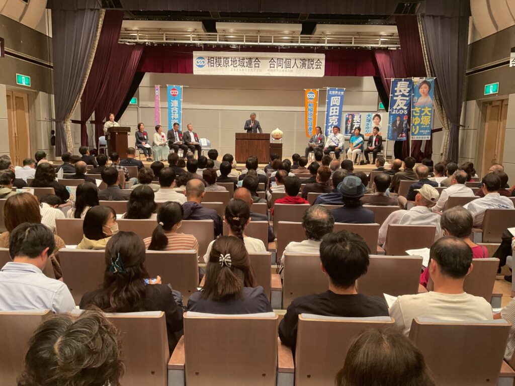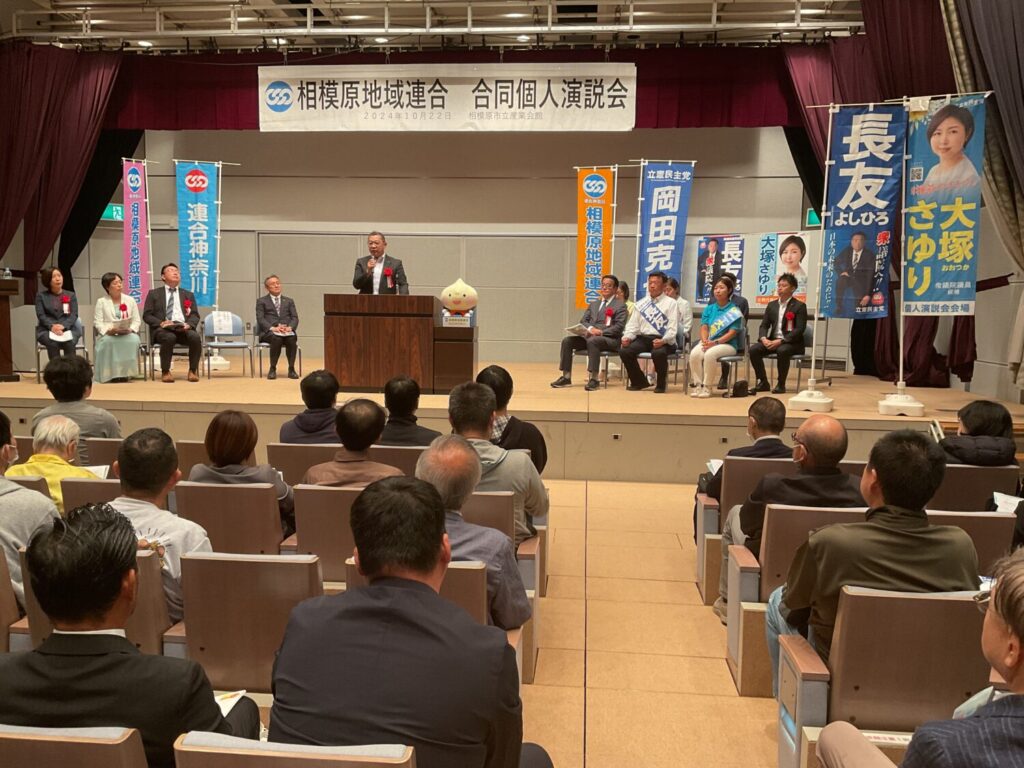 2024年10月22日 相模原市立産業会館 多目的ホールにて相模原地域連合決起集会を行い、連合神奈川・相模原地域連合主催、第50回衆議院議員選挙、立憲民主党神奈川14区長友よしひろ候補、20区大塚さゆり候補による、立憲民主党から岡田克也 前幹事長を招いての、最終決戦へ向けた個人演説会を実施しました。