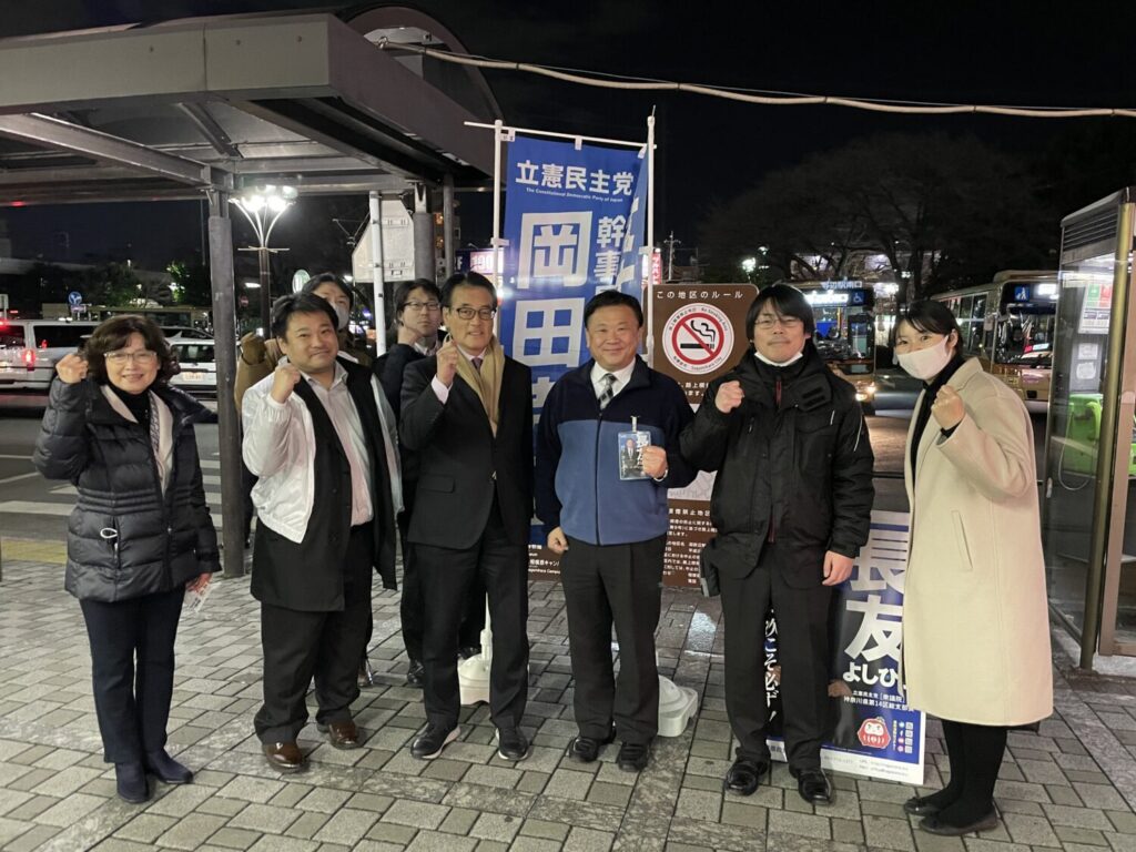 岡田克也立憲民主党幹事長も応援に駆けつけ、激励、ビラまきによる街頭行動を行い、声掛けを実施しました。