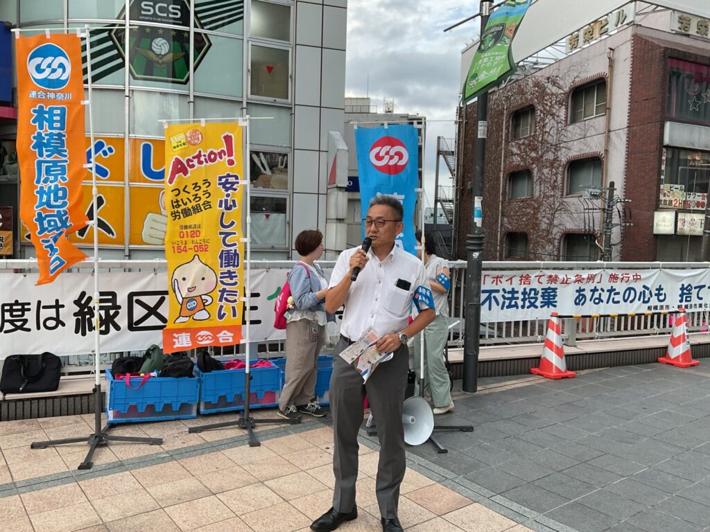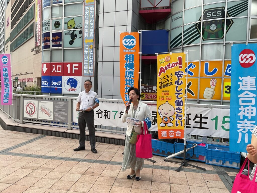 2025年6月23日(月)、相模原地域連合は橋本駅北口にて「連合神奈川の日 街頭行動」を実施しました。この取り組みは、連合神奈川が呼びかける統一行動日の一環であり、私たち相模原地域連合も地域の仲間とともに声をあげました。
